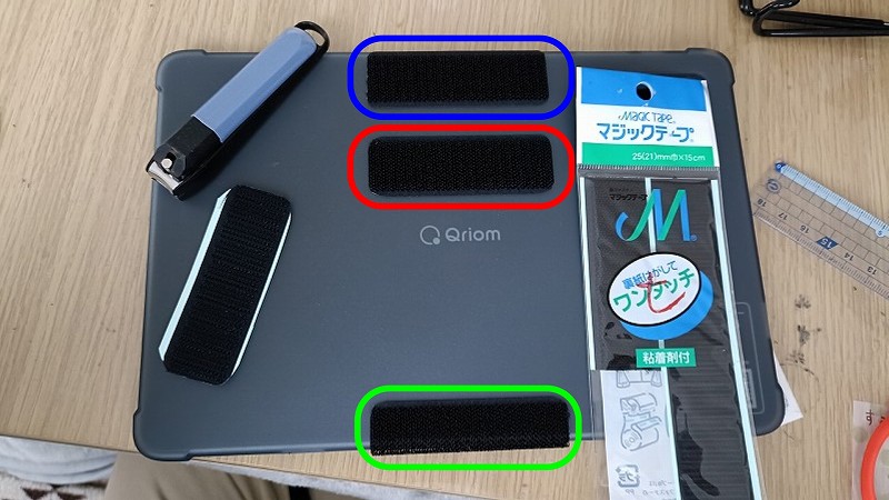 取り外して持ち運びするタブレット側に、マジックテープの「やわらかい方」を貼っています。
