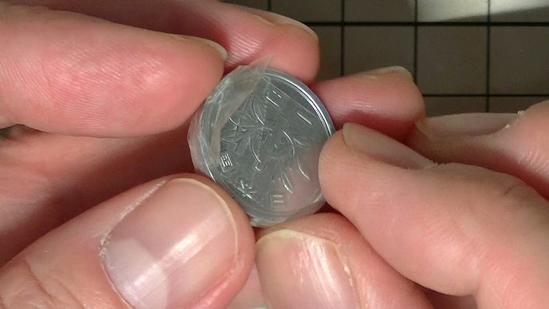銅テープで作ったダミー電池用の端子を、1円玉に貼り付けします。