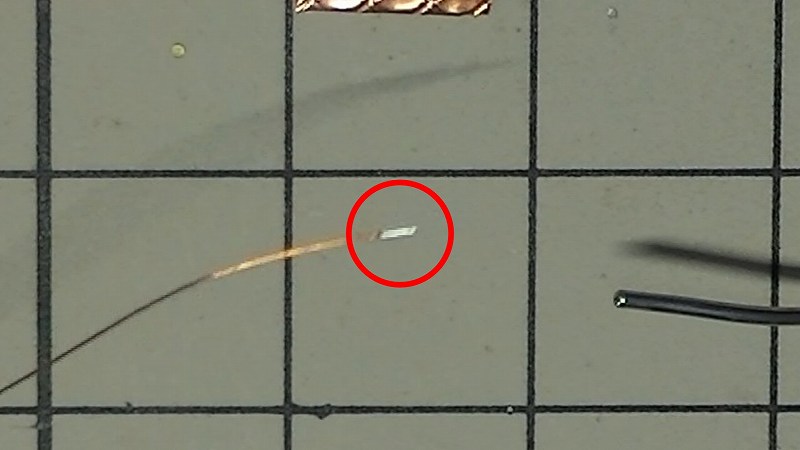 赤丸部分が、絶縁被膜が溶けて導通した部分です。