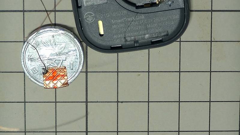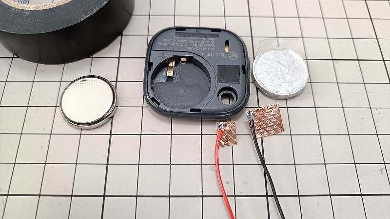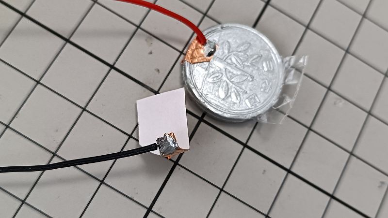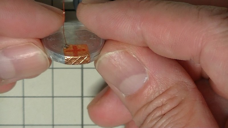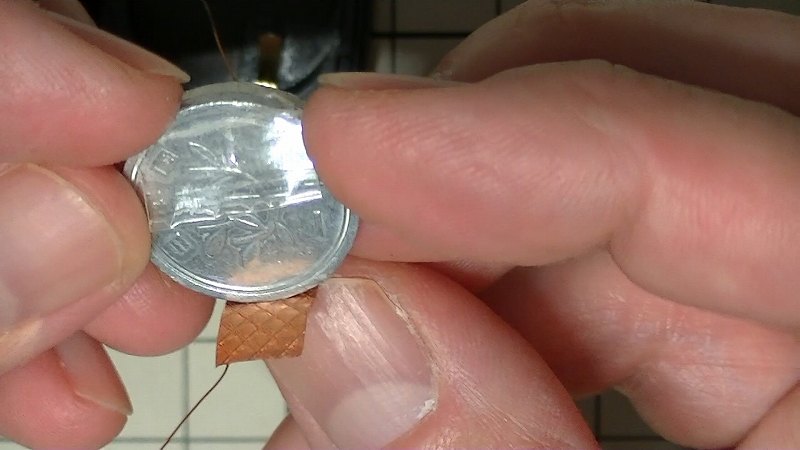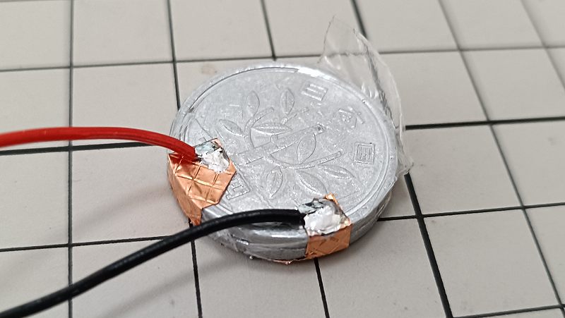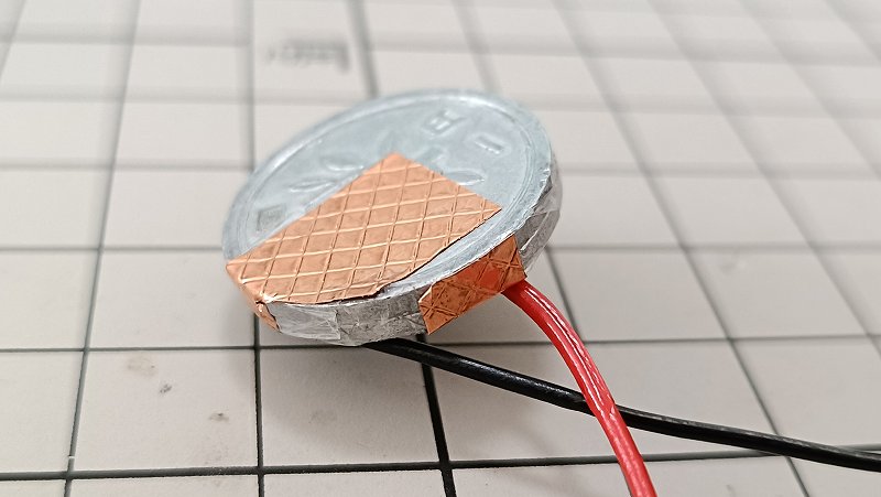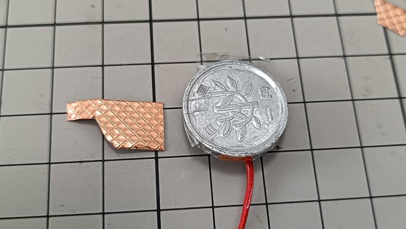 プラス用の端子は、1円玉の側面にある感じなので、側面から銅テープを貼りました。